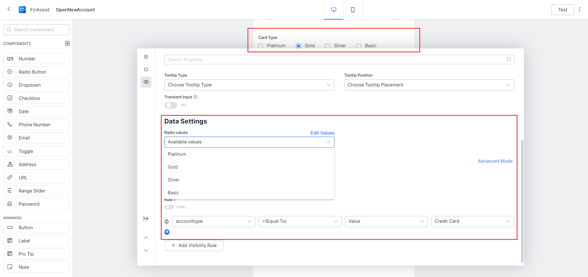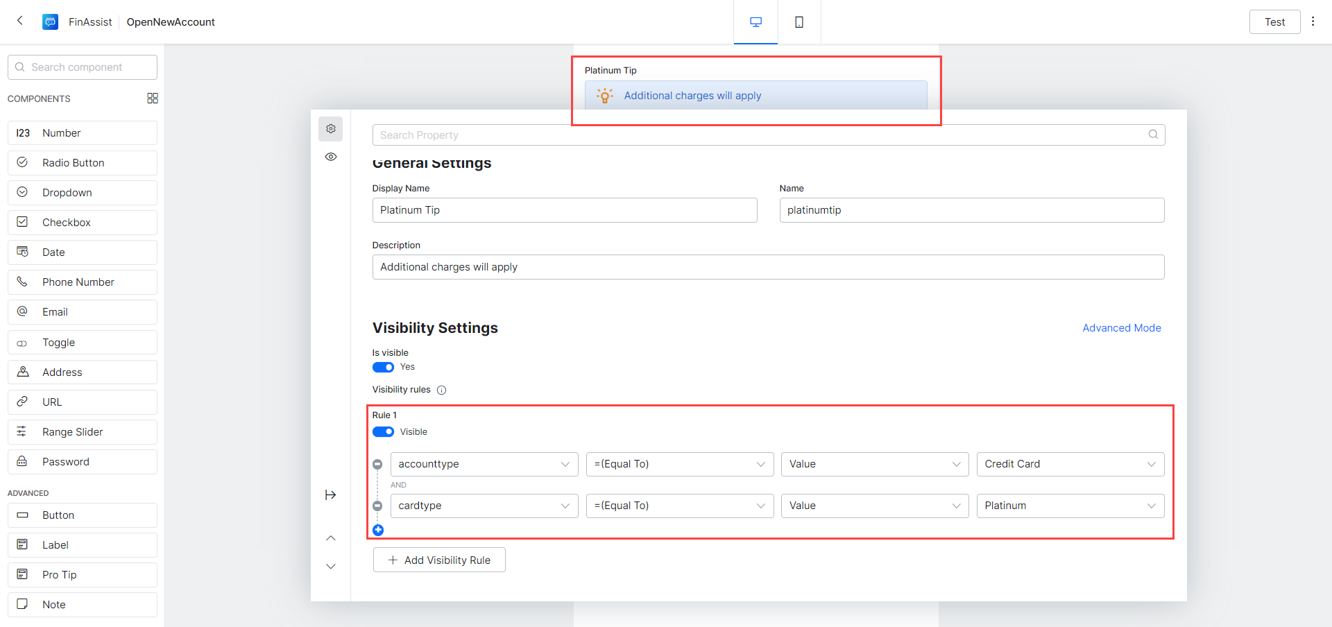 Finally, the Pro-Tip, when user selects a Platinum card. Drag and drop a Pro Tip component onto the form and set the following values:
