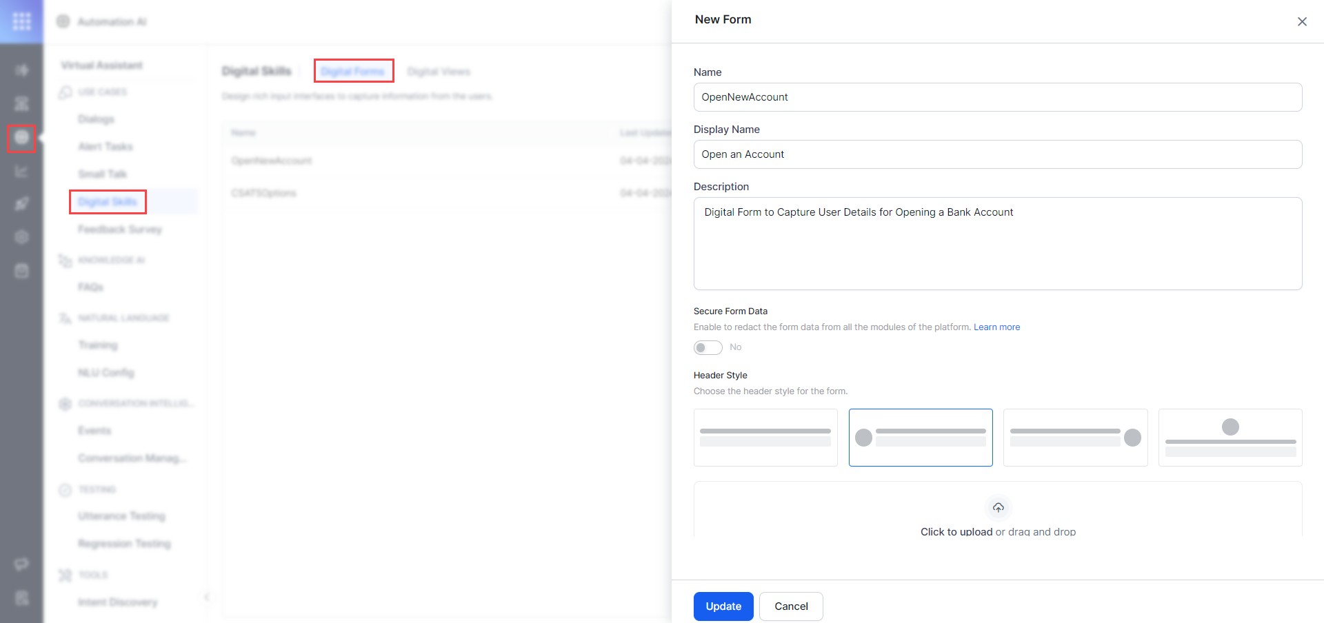 - Navigate to Automation AI > Digital Skills > Digital Forms to access the Digital Forms page.