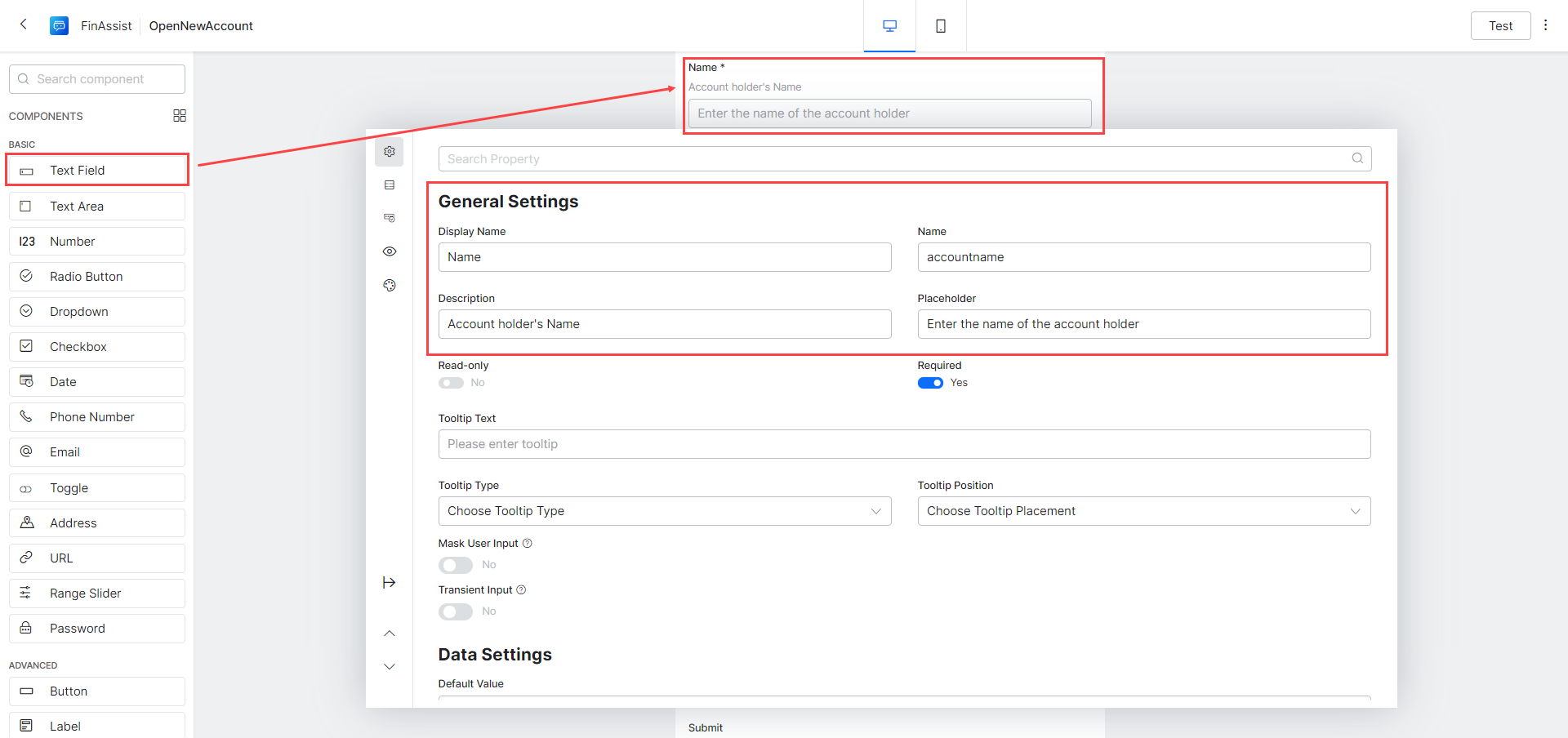 - Drag and drop a Text Field component onto the form.