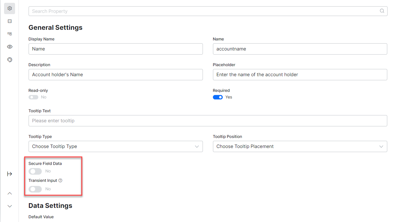 - If Secure Form Data is disabled, the caption of this toggle is Secure Field Data. At runtime, the data of this field will be redacted. This would be a component level setting for data redaction.