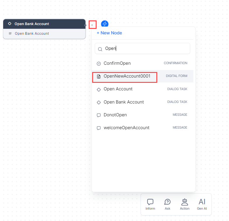 Click the + next to the Root intent node and select the form (OpenNewAccount) that we created earlier from the list. Note that the form name will contain numeric suffix in the form of 001, 002 and so on depending on the number of its instances already added to the AI Agent.