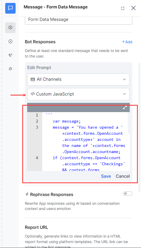 Select the Custom JavaScript option and enter the following code. This code would capture from the context object, the data submitted by the user in the Form and display it accordingly.
