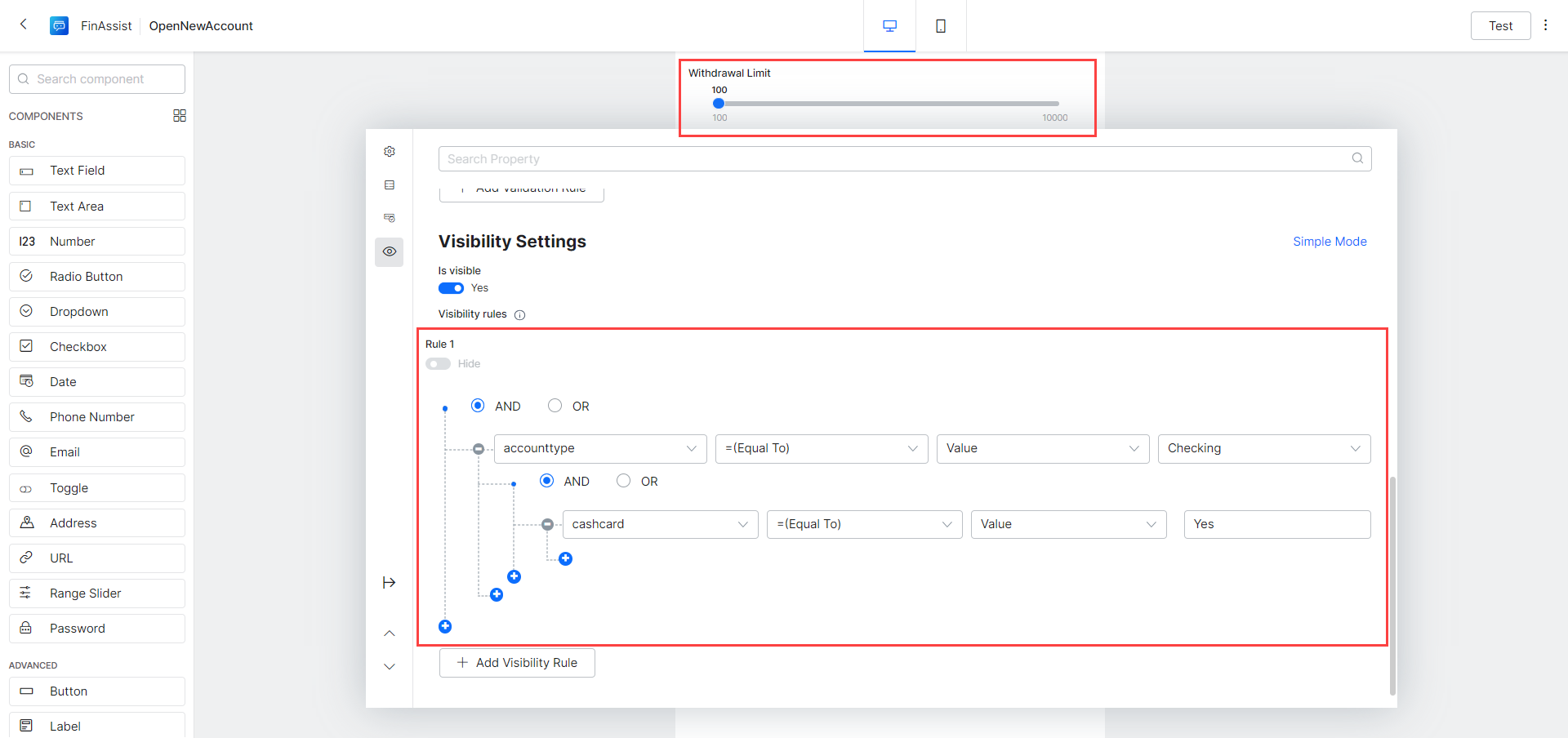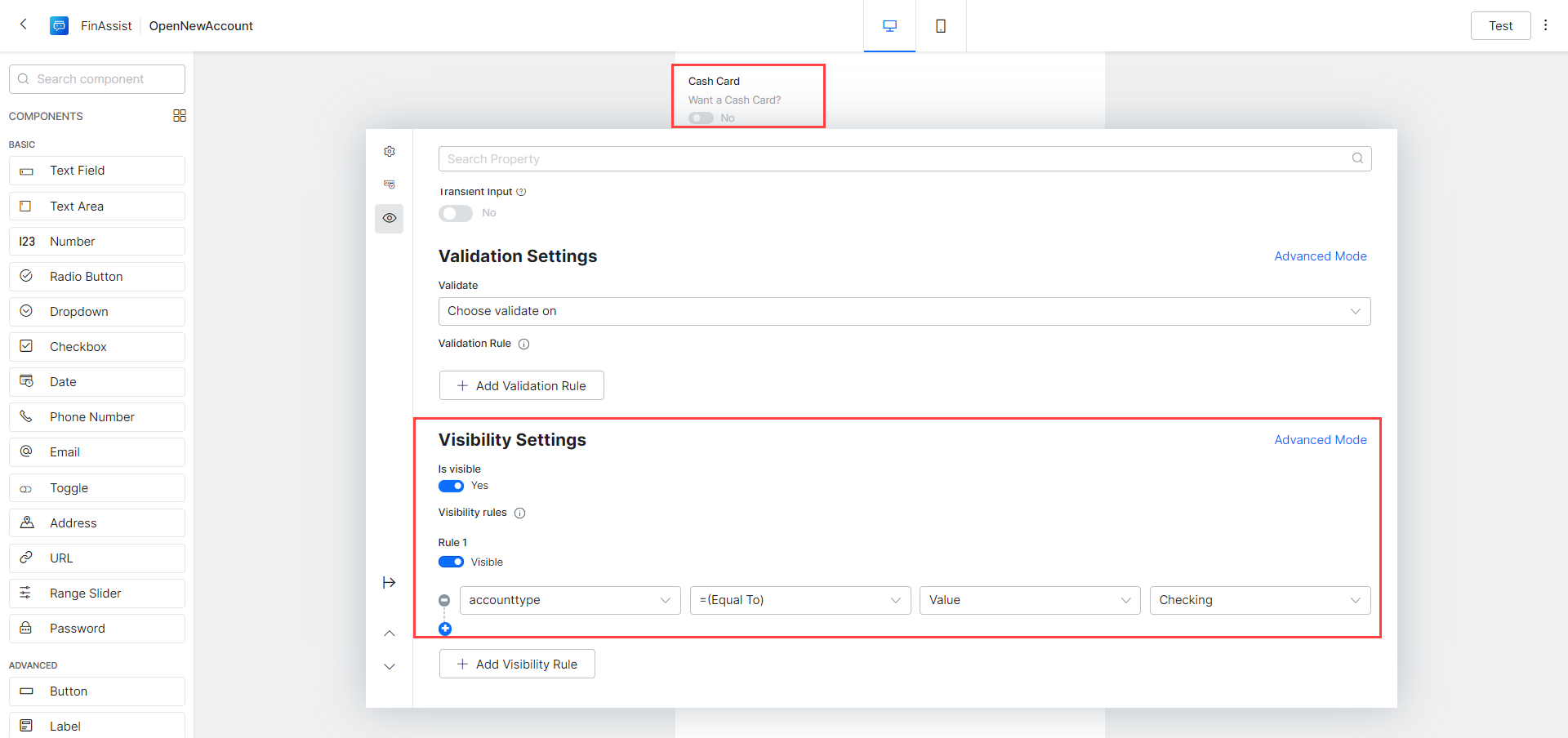 - Add Visibility Rules – Rule 1 field to be visible when, select, accounttype field, =(Equal To) operator, Value comparison with Checkings value AND selecting cashcard field, =(Equal To) operator, Value comparison with Yes value.