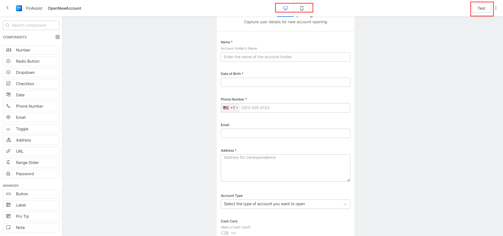 Next, for the Cash Card option when the account type is selected to be a Checkings account. Drag and drop a Toggle component onto the form and set the following values: