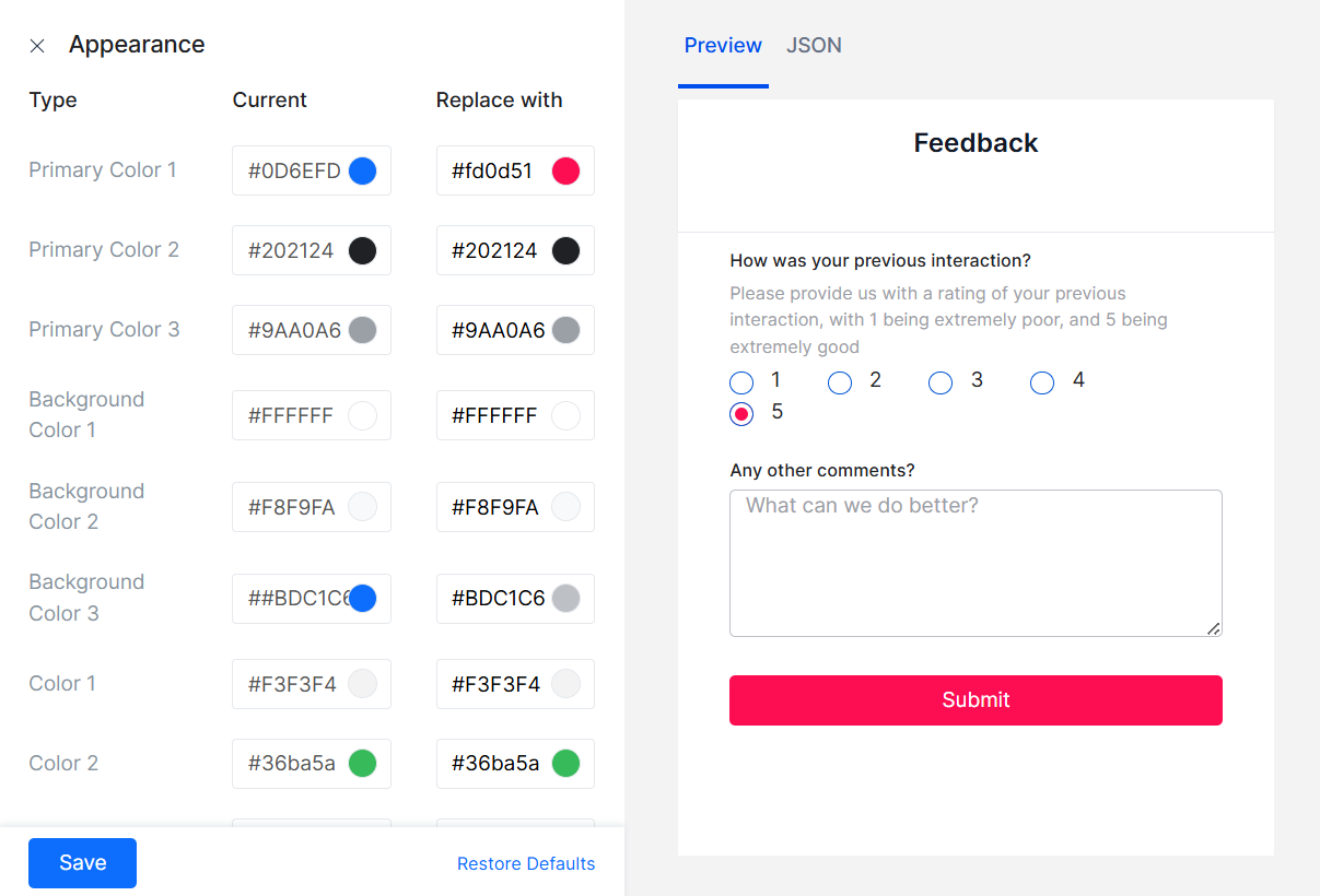 - Components: for field and form level customizations like Form Header, Description, Field Names, Descriptions, Default Text, Validation rules etc.