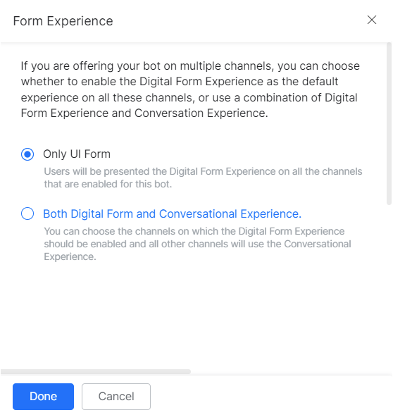 - A form is included as a component in the task. The dialog task offers a Form Experience and Conversation Experience based on the channel of interaction. Learn more by reading about the Form Node.