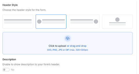 Select form’s Header Style: You can choose a specific header style from the listed illustrations – the circle indicates the position of logo/icon with respect to the title of the form in the header. Click the card to select the style. If it has a logo, you can upload an image file (jpg or png) for the logo.