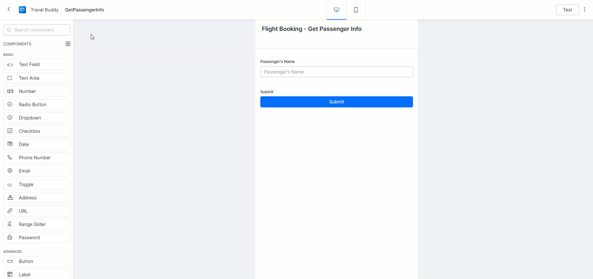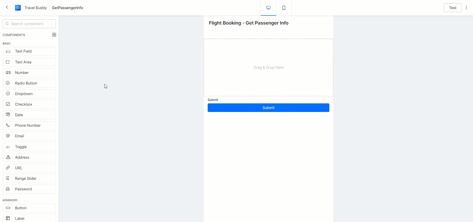 To get the form definition that is provided as a response in the koreUtil.getFormDefinition and keys that need to be customized, refer to the digital form's JSON view. Navigate to Automation AI > Digital Skills > Digital forms and open the form that you wish to configure. Click Test on the Form Design view, then select the JSON tab.