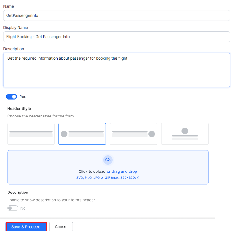 Turn on the Description toggle if you want to show a description of the form in the header.