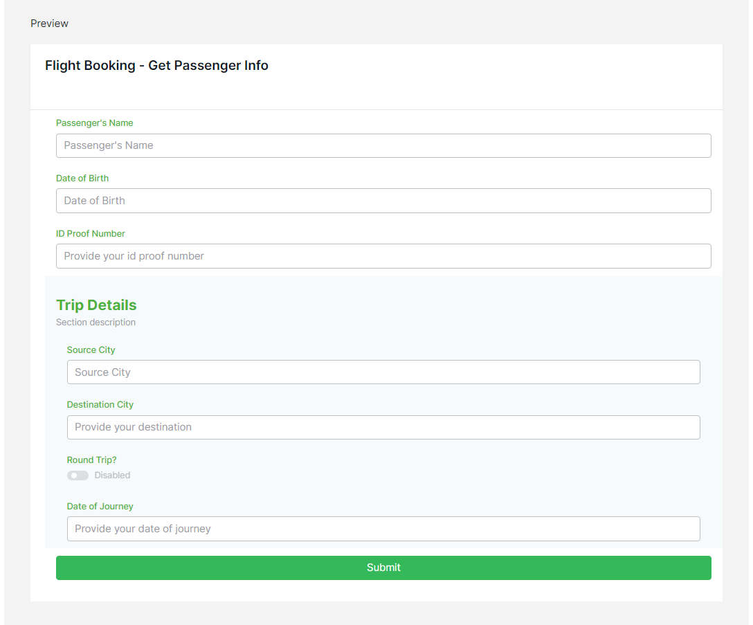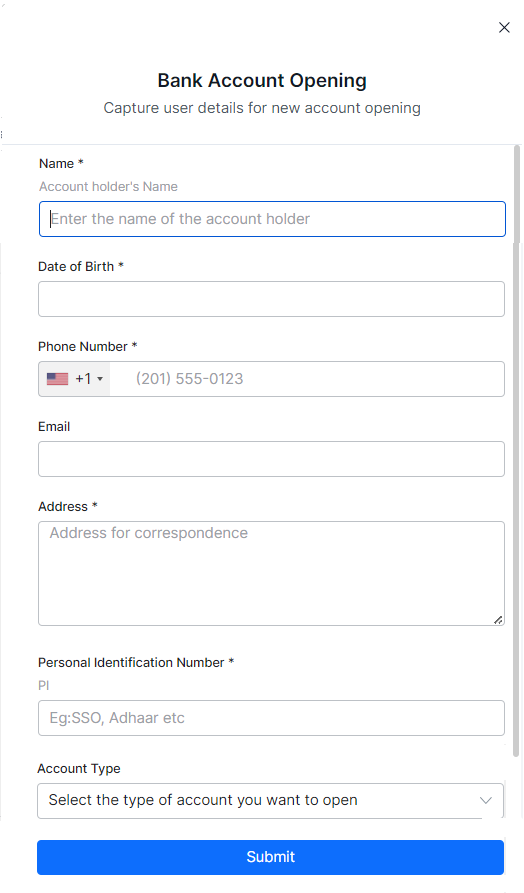 Digital Forms provide a range of input fields that allow your AI Agent to capture the required details from end-users. After the users complete the form, the input is submitted to the AI Agent to proceed with the task at hand.