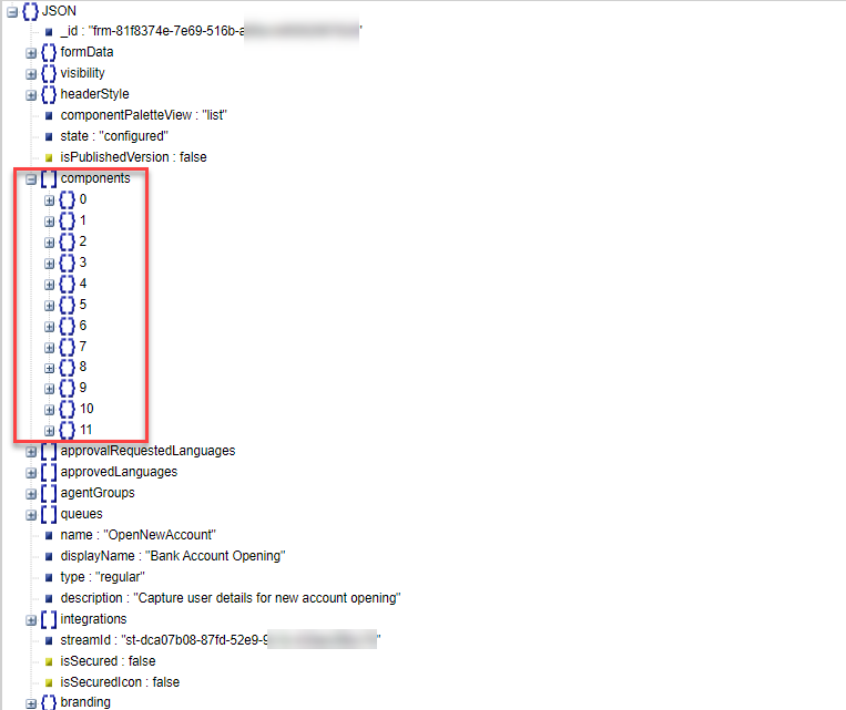 Upon expanding the components section, which appears as an array in the JSON viewer, you see an indexed sub-sections that indicates the number of fields in the form. For example, the components section in the below screenshot shows that there are 12 fields in the form.