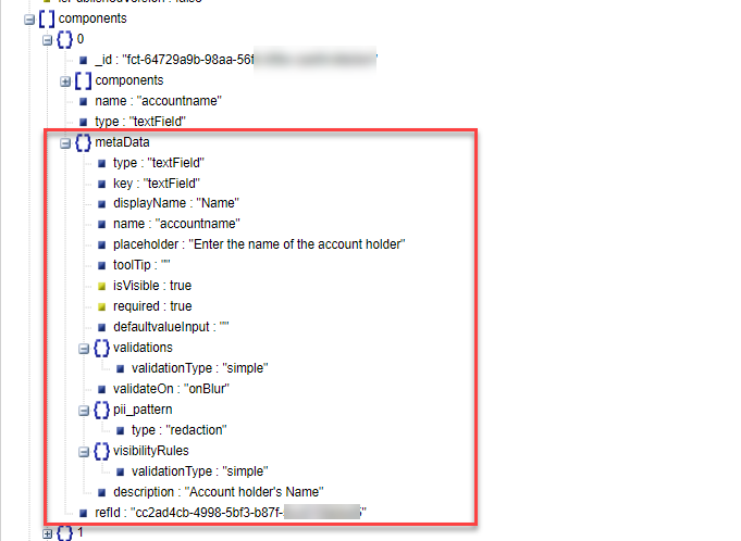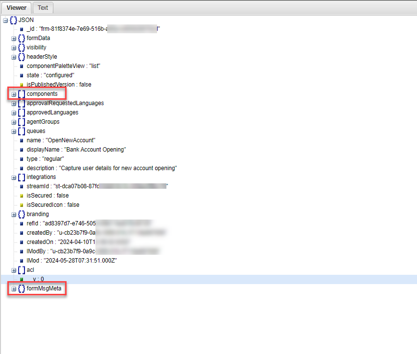 The entire JSON is usually large, and it may be a challenge to find out the keys that need to be manipulated. You may consider copying the entire JSON, pasting it in any JSON Viewer application wherein you can collapse and expand the sections. You can expand only the components and formMsgMeta sections for convenience.