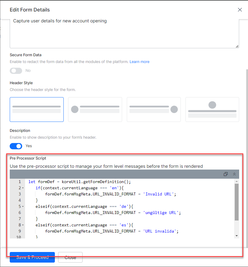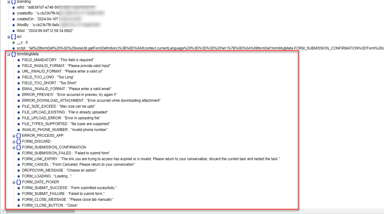 let formDef = koreUtil.getFormDefinition(); if(context.currentLanguage === 'en'){ formDef.formMsgMeta.URL_INVALID_FORMAT = 'Invalid URL'; } elseif(context.currentLanguage === 'de'){ formDef.formMsgMeta.URL_INVALID_FORMAT = 'ungültige URL'; } elseif(context.currentLanguage === 'es'){ formDef.formMsgMeta.URL_INVALID_FORMAT = 'URL invalida'; } else{ formDef.formMsgMeta.URL_INVALID_FORMAT = '無効なURL'; }Note
