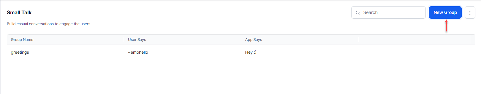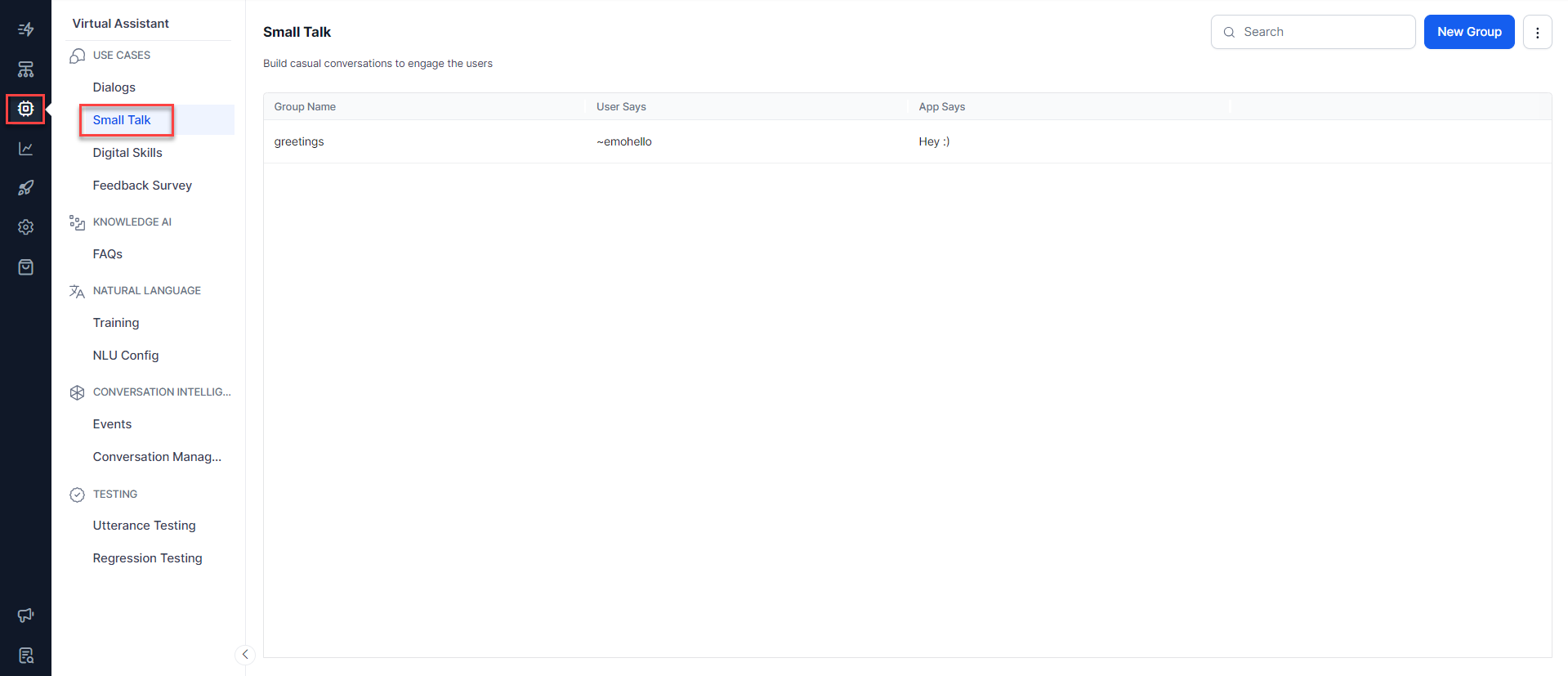 The various user queries in Small Talk are categorized into groups and assigned hierarchical structure. The Greetings category is auto-generated by default for all new assistants. This group contains various questions related to greetings and pleasantries. You can define additional groups or categories and build interaction flows under each group.