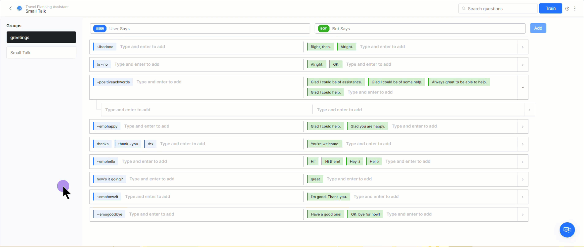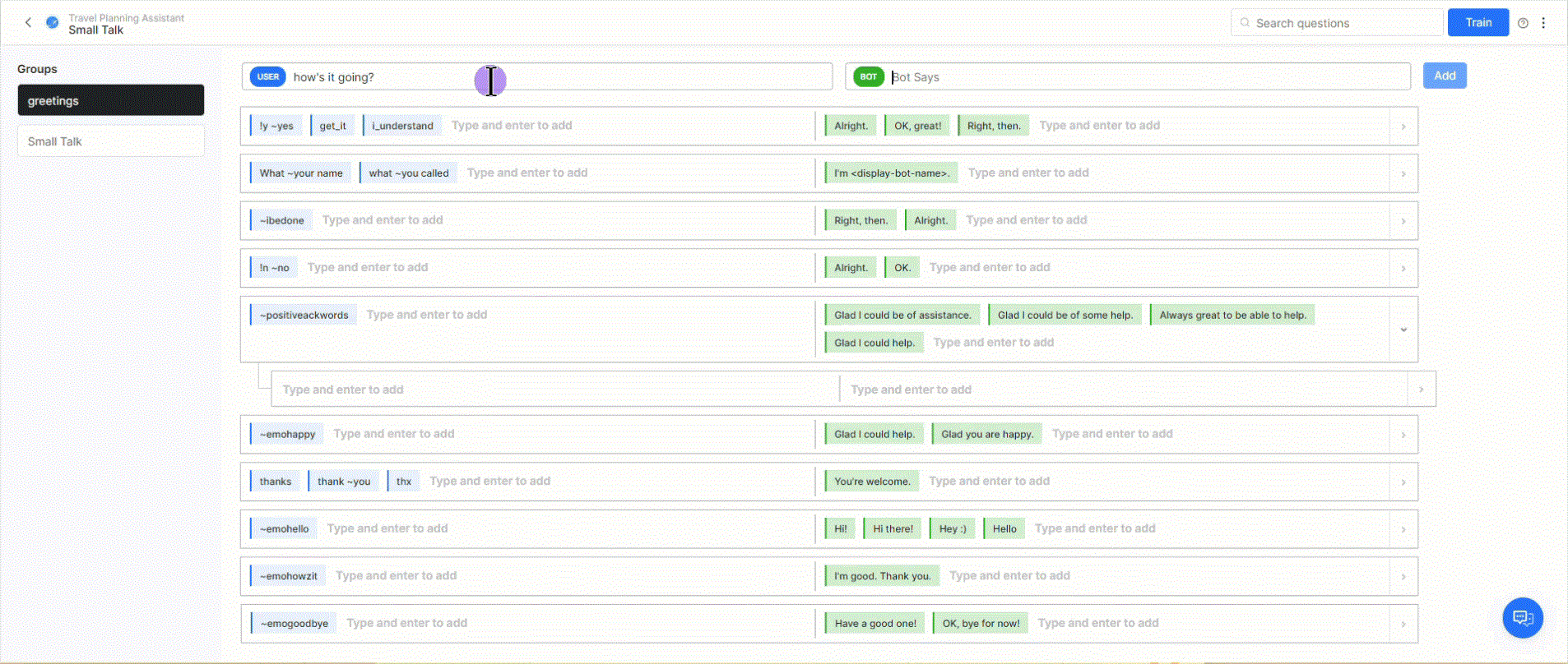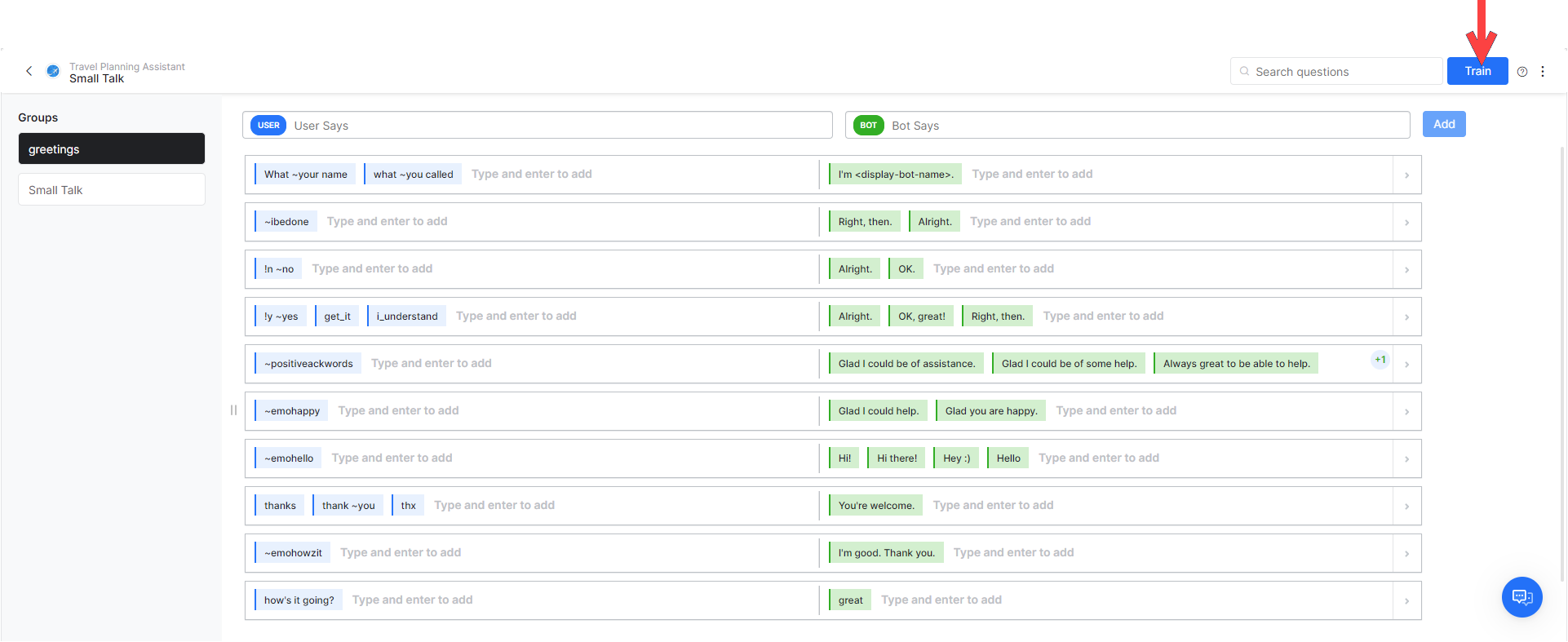 Once you have made changes to the Small Talk, it needs to be trained for the AI Agent to pick up the Small Talk. Click Train on the Small Talk editor screen to train the assistant.