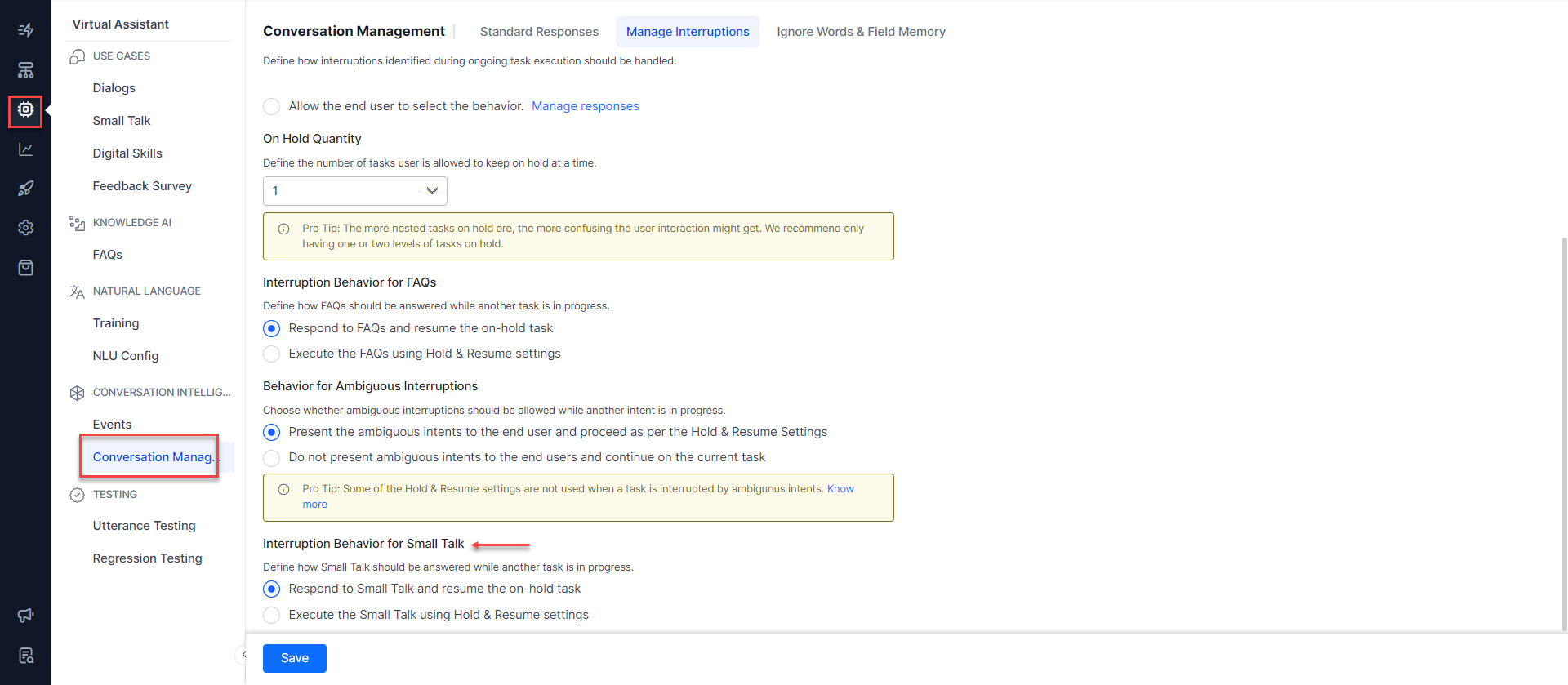 - Interruption Behavior for Small Talk is handled using the following options under Automation AI > Conversation Management > Manage Interruptions > Interruption Behavior for Small Talk