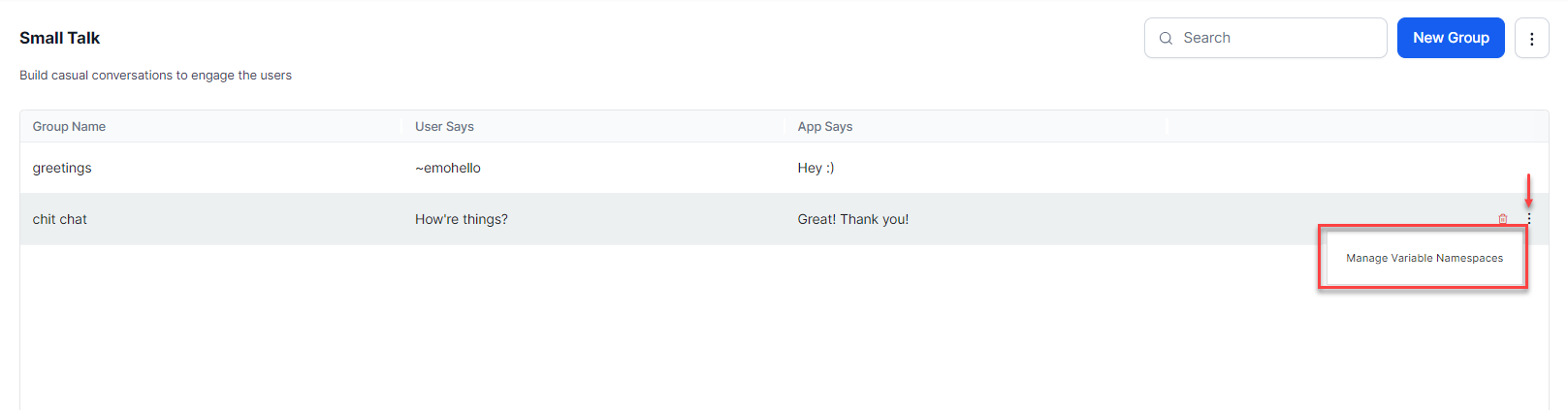Settings that will allow you to Manage Variable Namespaces by associating a variable namespace to use with this Small Talk group. This option is visible only when the variable namespace is enabled for the AI Agent. For more information, refer to this link.