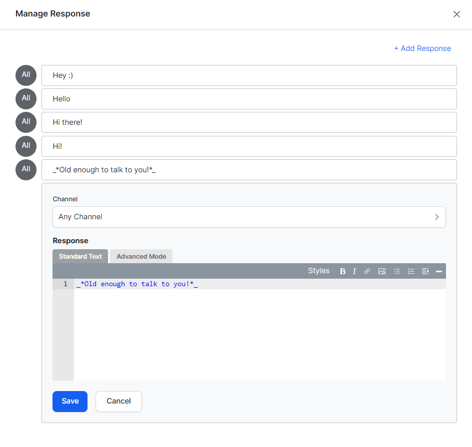 Responses are Channel-specific and JavaScript formatted. By clicking the Settings (gear icon) that appears next to the response, when you hover over it you will reach the Manage Response window. Here is where you can configure the following: