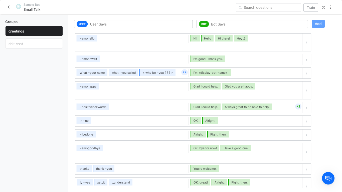 Small Talk is a series of User Utterances and Bot Responses. The primary objective of Small Talk is to engage users in casual conversations and in general, functional topics or business transactions are not included in Small Talk.