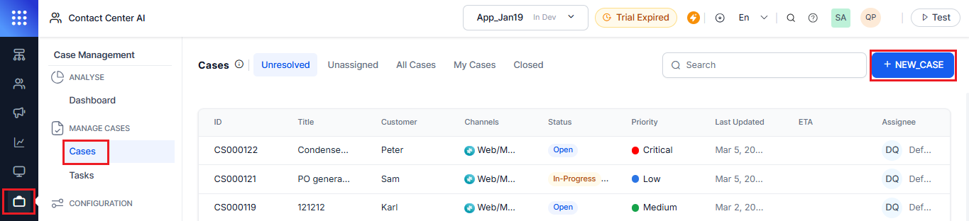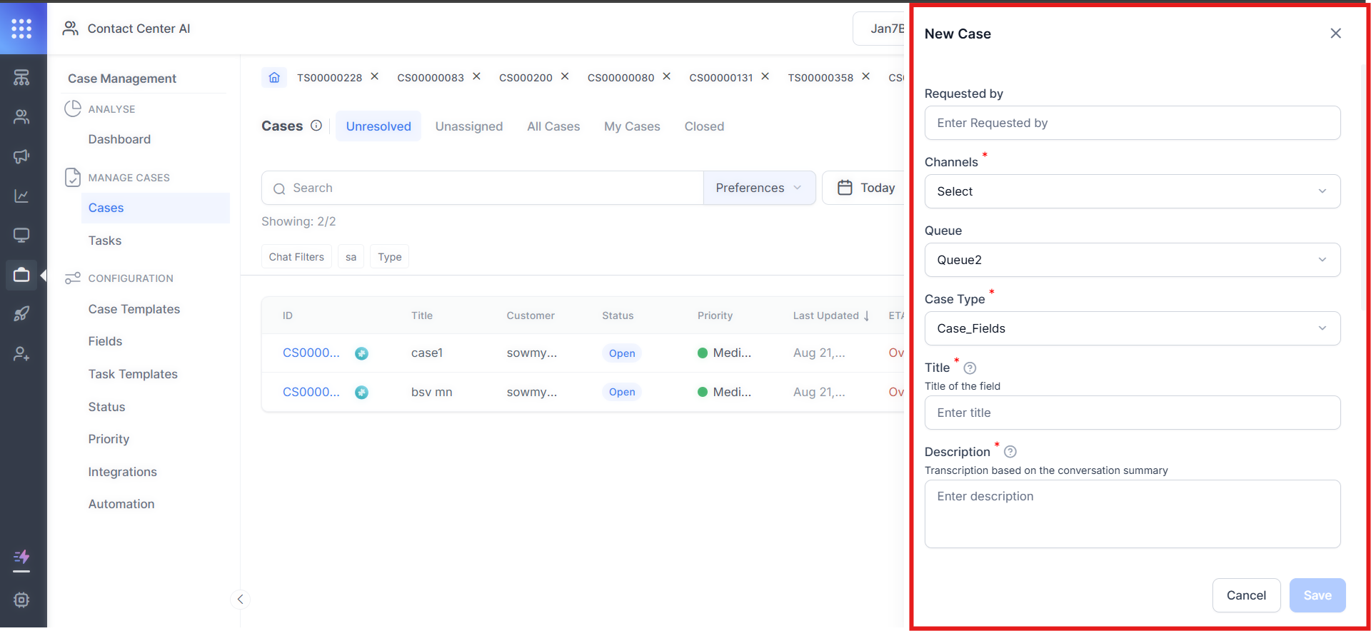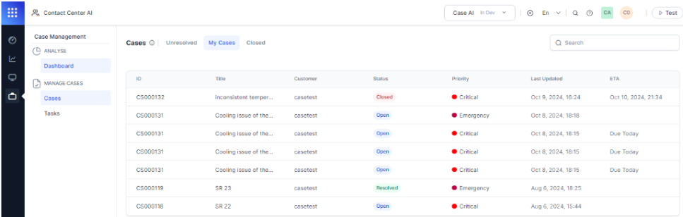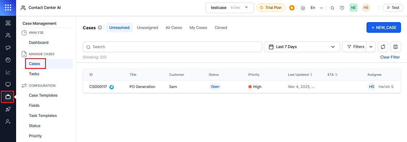 Access cases by navigating to Contact Center AI > Case Management > Manage Cases > Cases. The unresolved cases page displays.
