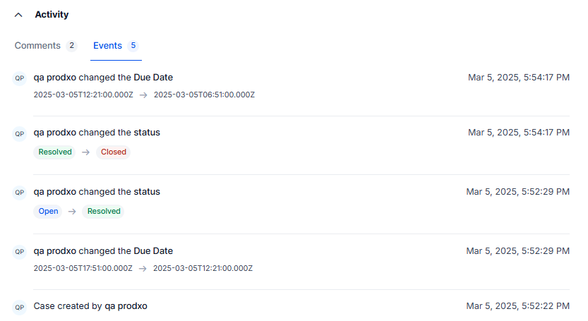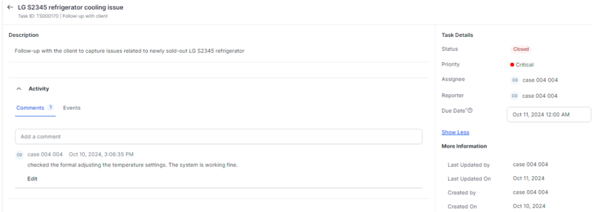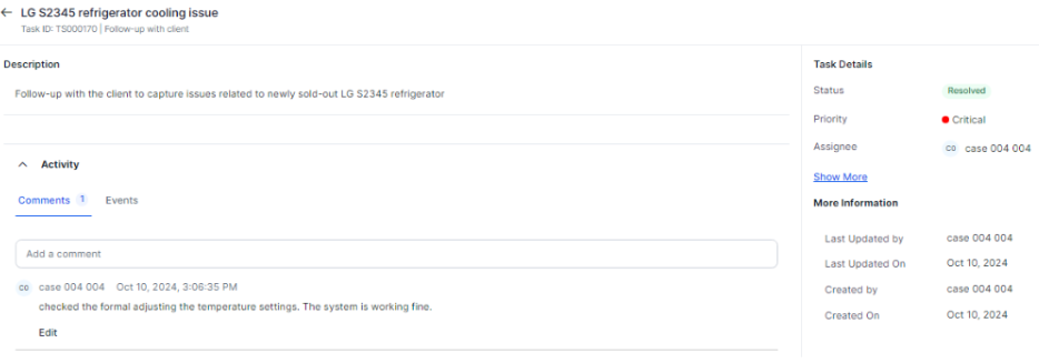After you complete tasks, verify that all customer issues are resolved. Ensure that all comments and events include the appropriate details for each task. This information helps you track communication progress and captures relevant information throughout the case lifecycle for future reference.