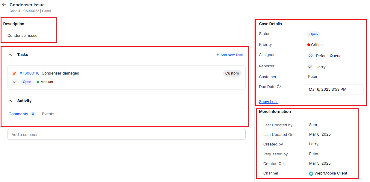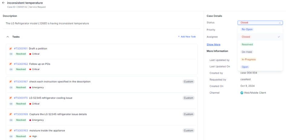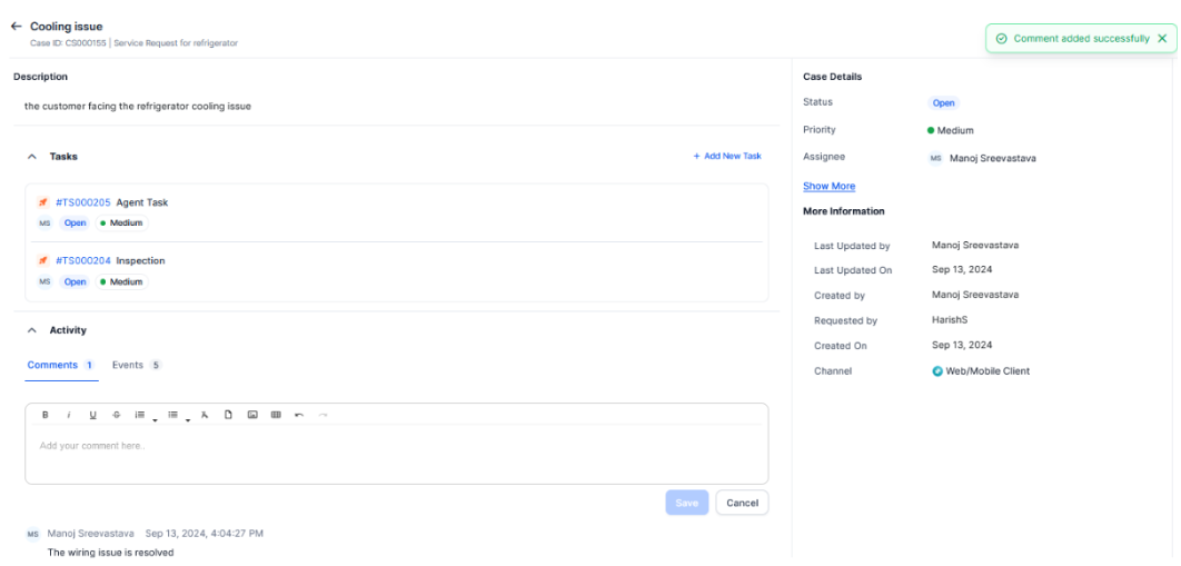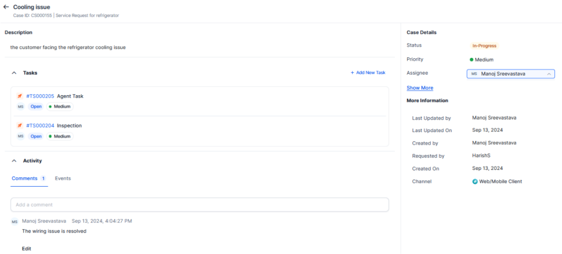 By clicking any of the existing unresolved cases, you can view the following sections of a case, such as associated tasks, customer details, current status, and activity logs.