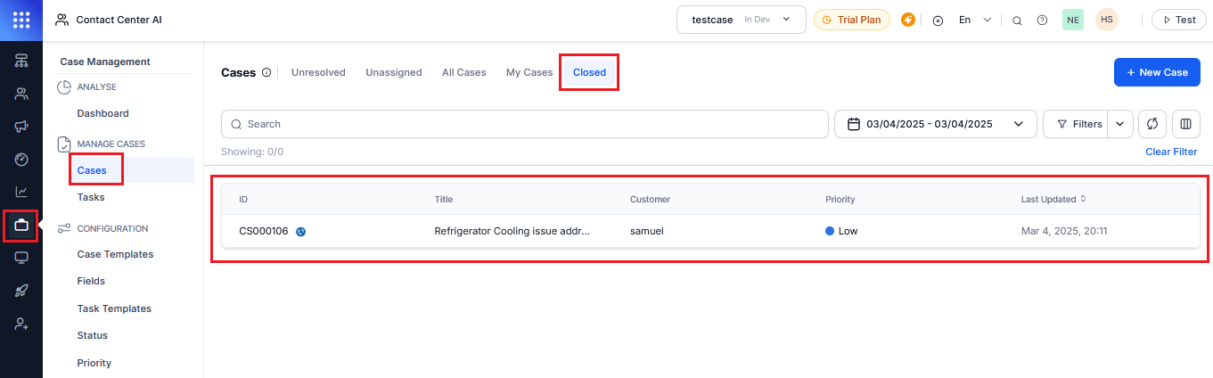 Search Cases: Search for cases based on various field values (for example, case ID, status, priority).