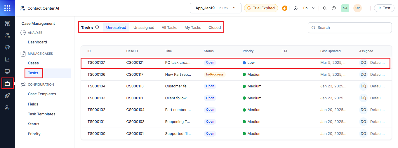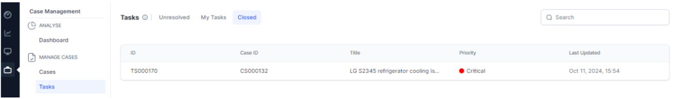 To access manage tasks, navigate to Contact Center AI > Case Management > Manage Cases > Tasks.