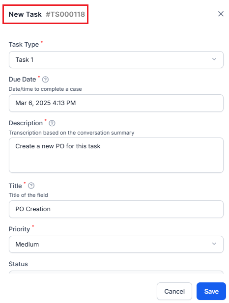 Click Save. A success message of the task creation is displayed, and a new custom task is created and assigned to the agent. Please note that agent cannot create or edit tasks once a case is closed. The system prevents task creation if required fields are missing or invalid.