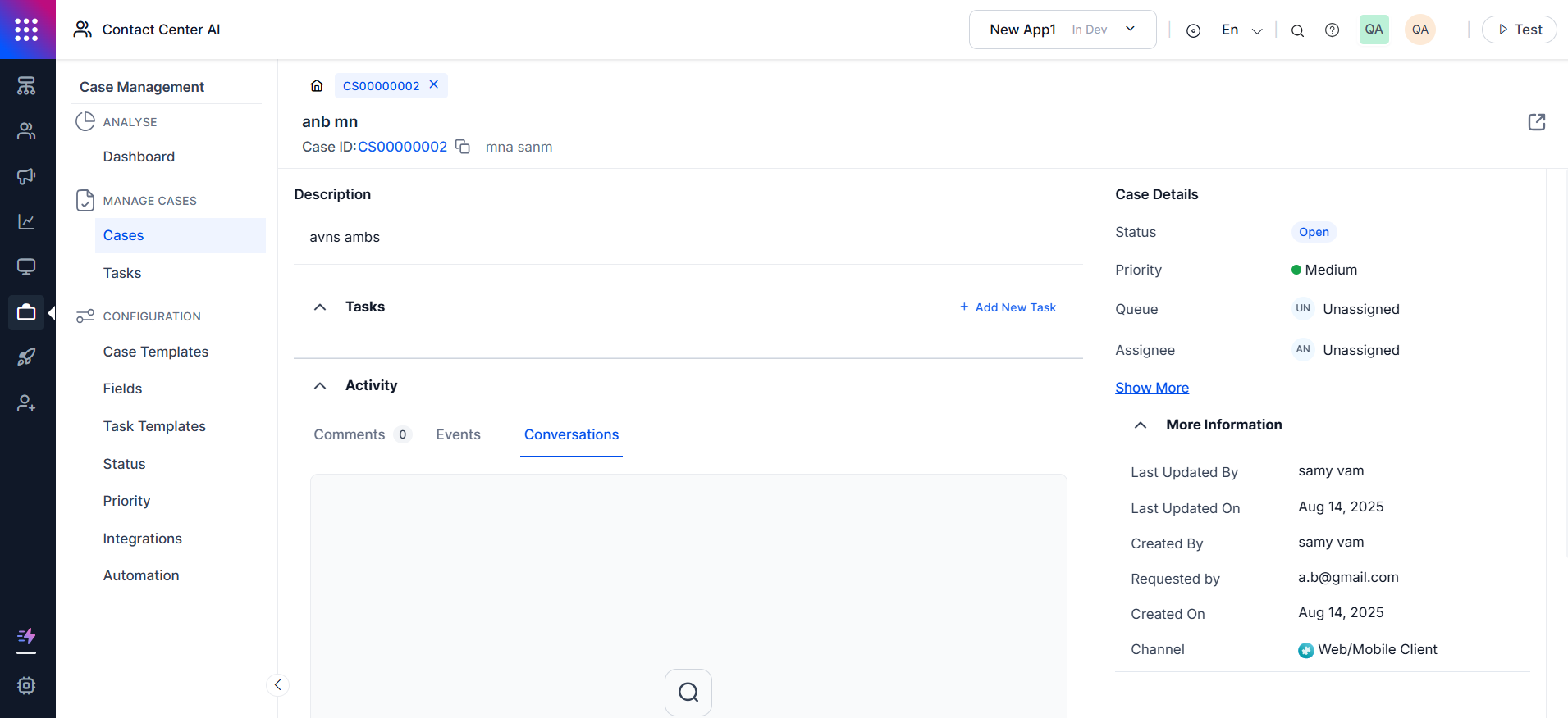 The View cases feature provides a case management interface that lets you access and manage individual support cases. The page also displays case activities, including comments, events, and conversations.