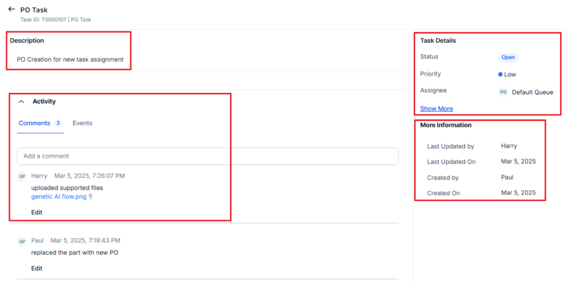 This section displays the task description, task details, current status, and activity logs. Click any existing unresolved tasks to expand and view detailed information.