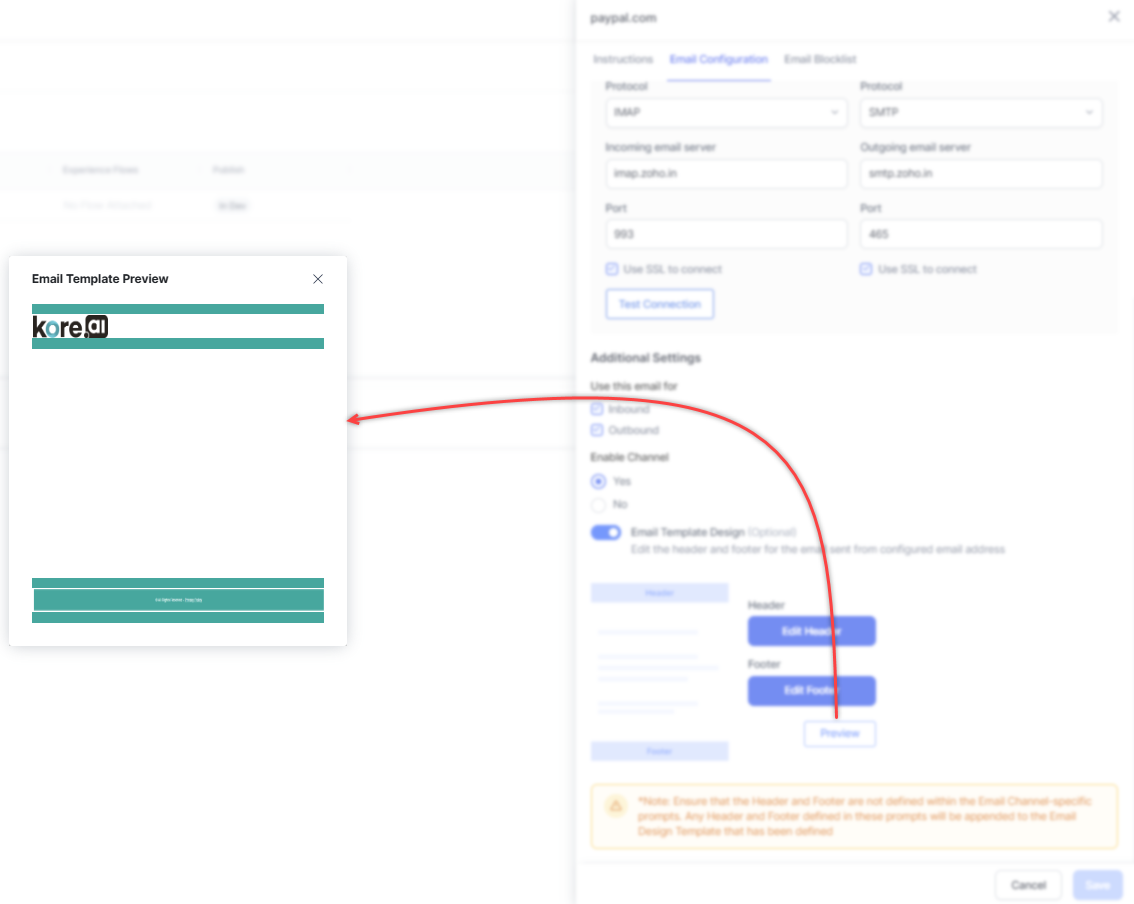 Contact centers need to enable forwarding to the email address configured in the Contact Center AI system. This ensures that any email received by the contact center from its end customer is automatically forwarded to the Kore domain. The Kore domain is linked to the experience flow, allowing seamless integration and management of customer inquiries.