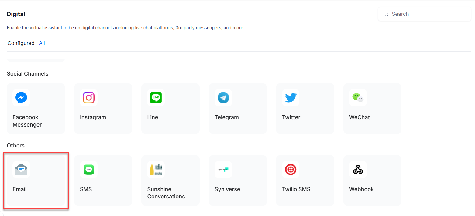 - Navigate to Flows & Channels > Channels > Digital > All > Email.