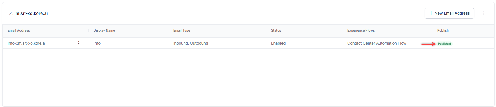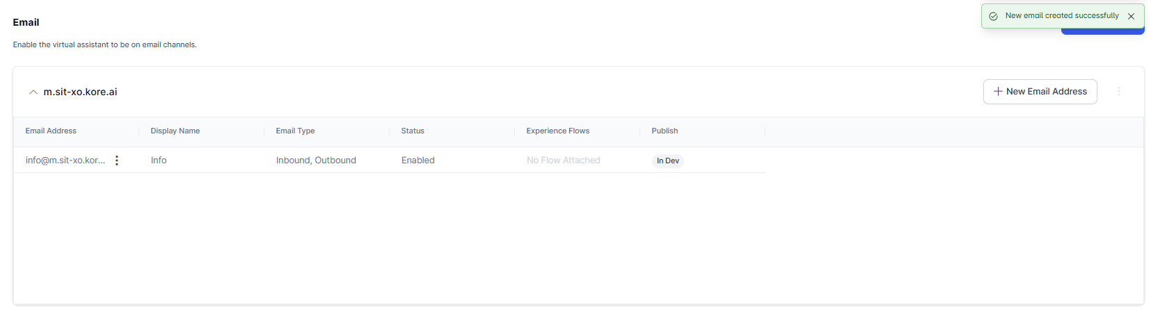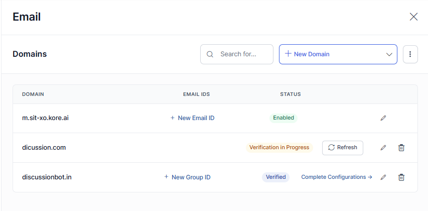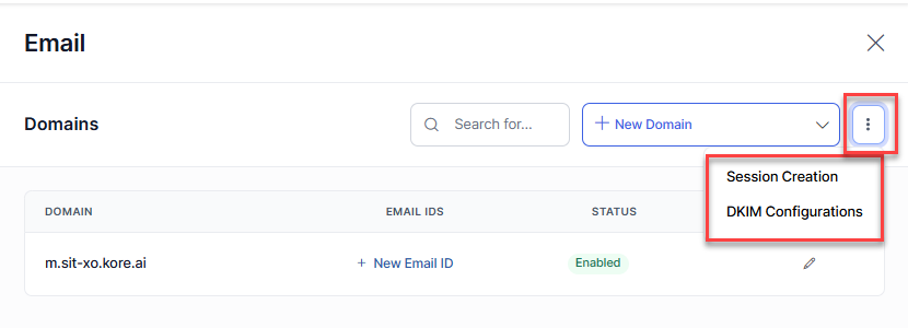 The Kore.ai domain is created by default. Click the + New Email ID for it to add the email ID.