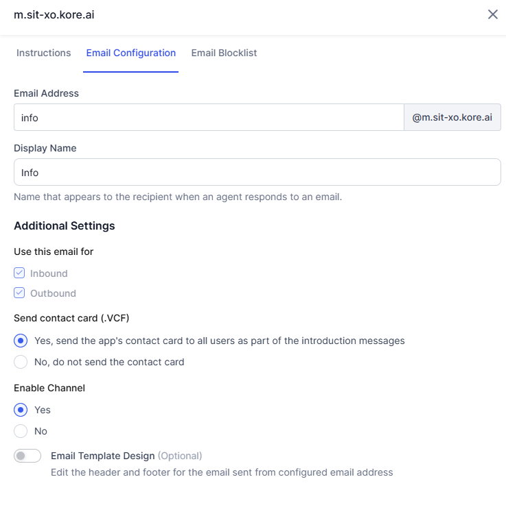 You can use the Kore.ai Email domain or create your custom Email Domain to configure your email addresses.