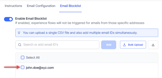 Email blocklisting allows admins to specify a list of blocklisted email addresses during email address creation preventing blocking interactions originating from blocklisted email addresses, automations, and subsequent agent transfers are prevented, reducing unnecessary processing, and ensuring that resources are allocated to valid interactions.