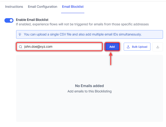You can add email addresses manually or using bulk upload.