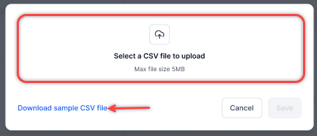 A pop-up window is displayed. Click Select a CSV file to Upload and upload the CSV file. You can download a sample CSV file by clicking Download sample CSV file.
