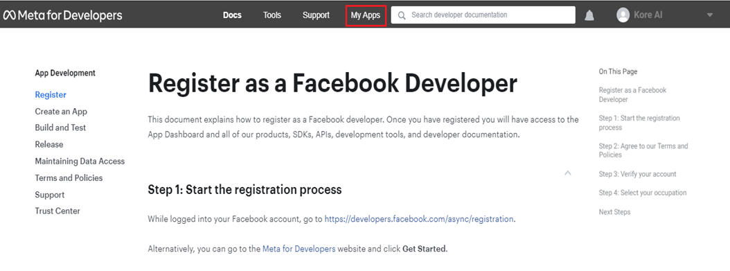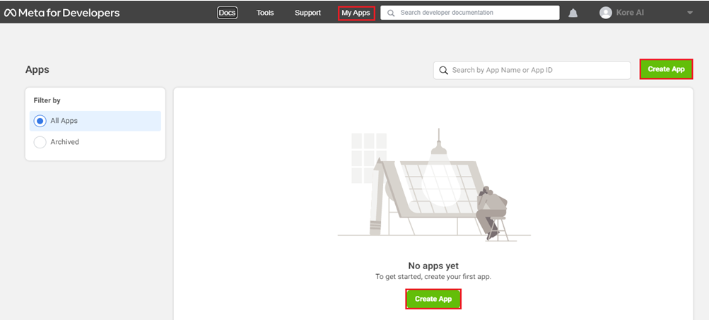 To add the Facebook Messenger channel to your AI Agent, you need a Facebook Developer account. With this account, you can configure the connection between Facebook Messenger and Kore.ai. Enabling the Facebook Messenger Channel on the App Builder helps your users chat with the AI Agent using their Facebook accounts.