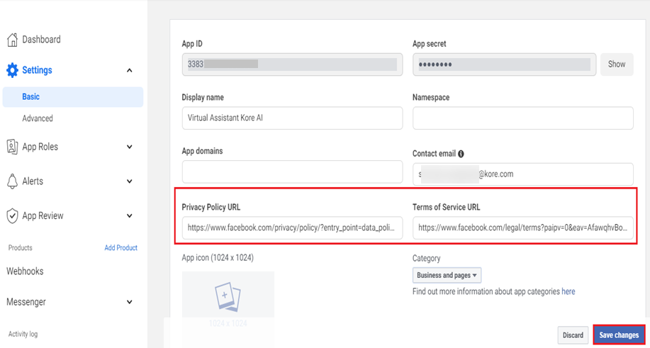 Navigate to Settings > Basic and configure the Privacy Policy URL and Terms of Service URL fields for the app.