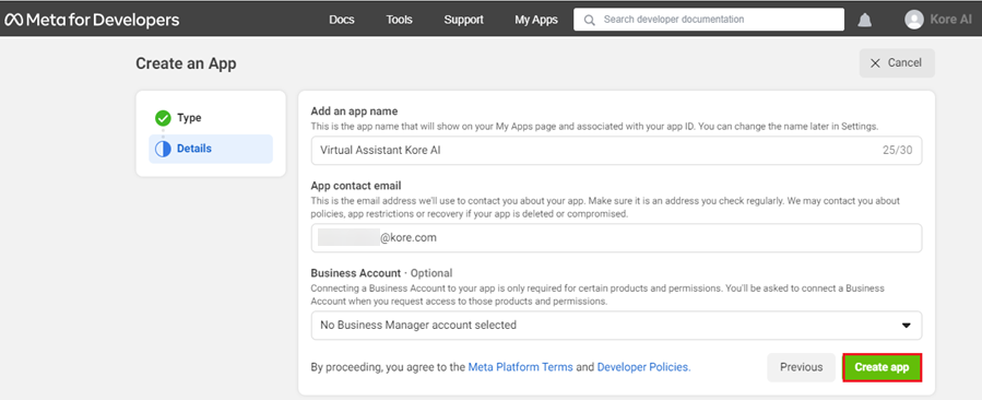 In the Details section, enter the required details, and click Create App.