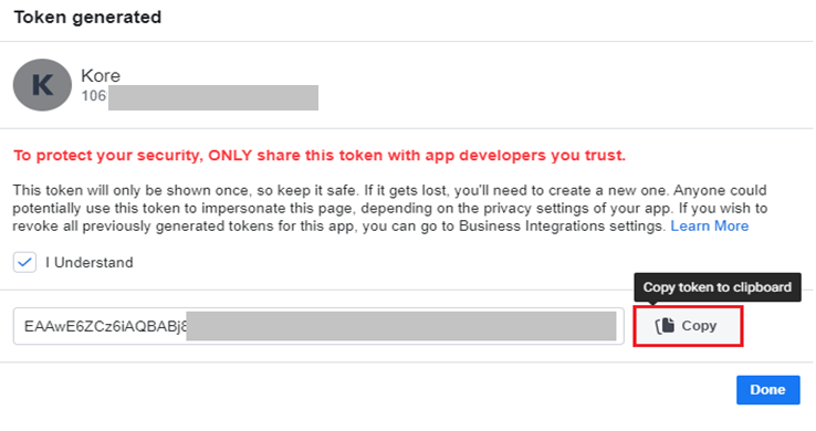 In the Token Generated window, select I understand and click Copy to copy the page Access Token.