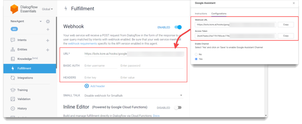 - Next, Enable Fulfillment. To configure the webhook integration between your Dialogflow agent and Kore.ai assistant, click the Fulfillment option on the left pane and enable the Webhook toggle switch.
