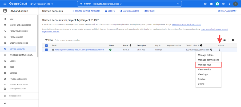 From the Manage service accounts page click the Actions button corresponding to your newly created account, then on Manage keys.