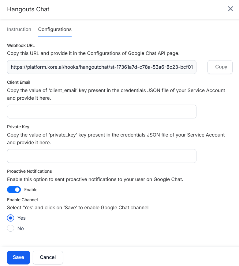 - Go to the Kore.ai Channels & Flows > Channels > Digital > All > Google Chat > Configurations and copy the Webhook URL.