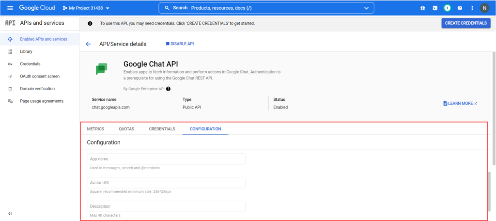 To set up the Google Chat API, you need to create credentials first, then configure its details and functionality, as follows: