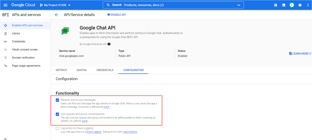Under Functionality choose both Receive one-to-one messages and Join spaces and group conversations options.