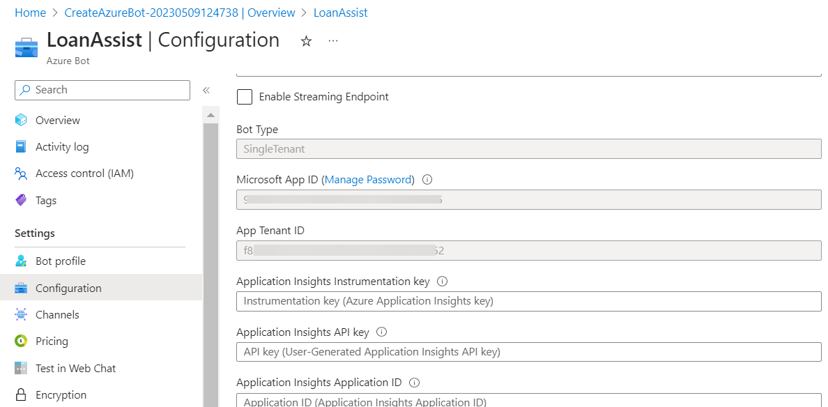 Close the Certificates and secrets section to return the Configuration section of the resource using the breadcrumbs. Make a note of the Microsoft App Id in the Azure Bot configurations page and provide it in the Configuration tab of this window.