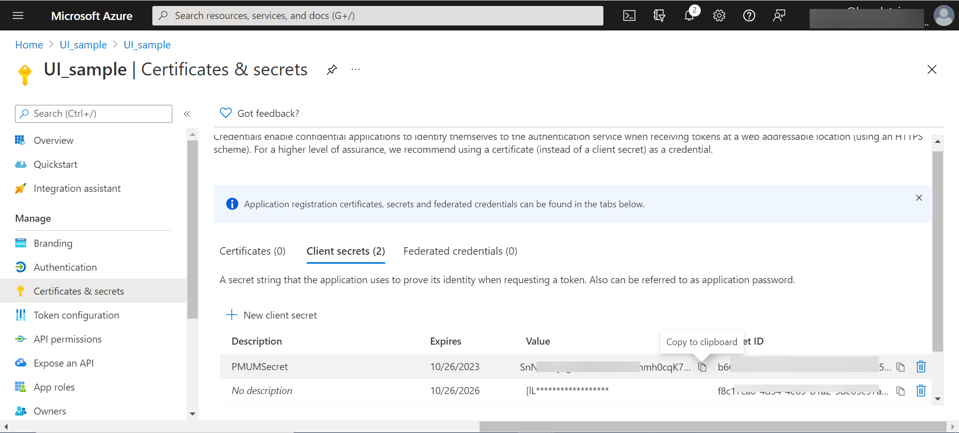 On Certificates & secrets page, click the + New client secret option, provide the necessary details, and then click the Add option to create a new client secret.