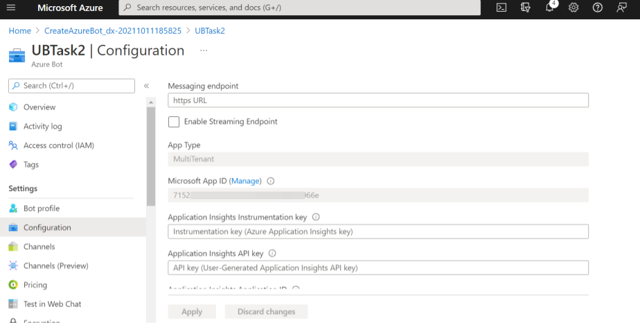 Paste the URL in the Messaging endpoint field on the Configurations module in Azure portal.